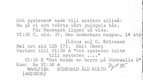 //// Och systeren* sade till systern alltså: //// Nu gå vi och tvätta vårt guldgula hår. ! //// För Danemark ligger så vida. ! //// VI:38 C, sid. 37, Den underbara harpan, 14 str //// (Länna sn) G. Ericsson Mel not sid 125 (?), Emil Öberg | //// Variant till VI:33 A "Och systeren talte \ //// till systeren ..." j //// VI:38 B "Det bodde en herre på Uddewalla ö" //// Kom: Se VI: 38 A SW^^T //// WAHLFISK SÖDERMLD ÄLD KULTH / //// (aminson) ////