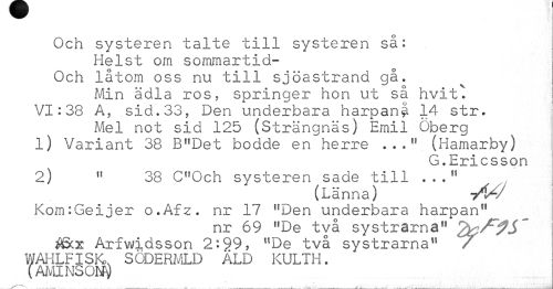//// Och systeren talte till systeren så: //// Helst om sommartid-Och låtom oss nu till sjöastrand gå. //// Min ädla ros, springer hon ut så hvitl VI:38 A, sid.33, Den underbara harpan^ 14 str. //// Mel not sid 125 (Strängnäs) Emil Öberg //// 1) Variant 38 B!,Det bodde en herre . .." (Hamarby) //// G.Ericsson //// 2) " 38 CflOch systeren sade till . //// (Länna) iÅ/J //// Kom:Geijer o.Afz. nr 17 "Den underbara harpan" //// nr 69 "De tyå systrarna" v //// Arfwidsson 2:99, "De två systrarna" / //// WAHLFISK,, SÖDERMLD ÄLD KULTH. (AMINSOM) //// v" / ////