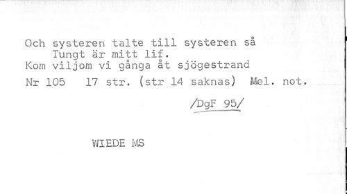 //// Och systeren talte till systeren så //// Tungt är mitt lif. Kom viljom vi gånga åt sjögestrand //// Nr 105 17 str. (str 14 saknas) Mel. not. //// /DgF 95/ //// WIEDE MS I ////