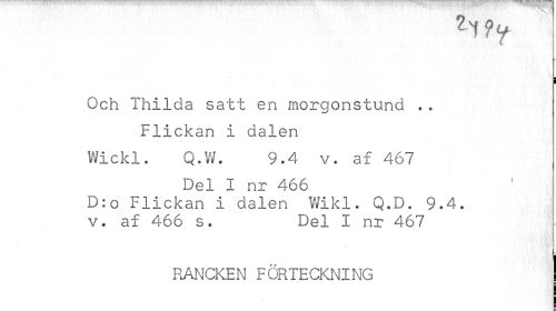 //// i //// Och Thilda satt en morgonstund .. //// Flickan i dalen //// Wickl. Q.W. 9.4 v. af 467 //// Del I nr 466 D:o Flickan i dalen Wikl. Q.D. 9.4. v. af 466 s. Del I nr 467 //// RANCKEN FÖRTECKNING ////