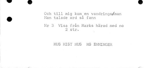 //// Och till mig kom en vandringsman ^ Han talade ord så fann //// Nr 3 Visa från Marks härad med no //// 2 str. //// MUS HlST MUS MS ENNINGER ////