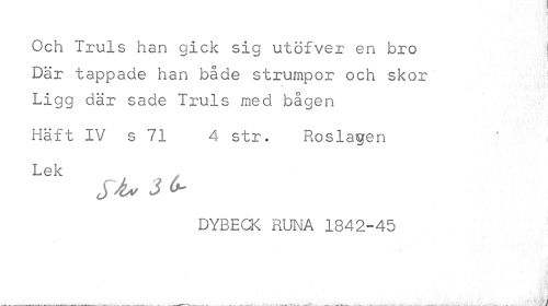 //// I //// Och Truls han gick sig utöfver en bro ! //// Där tappade han både strumpor och skor Ligg där sade Truls med bågen //// Häft IV s 71 4 str. Roslagen Lek //// DYBECK RUNA 1842-45 //// % //// . ¦ -i ////