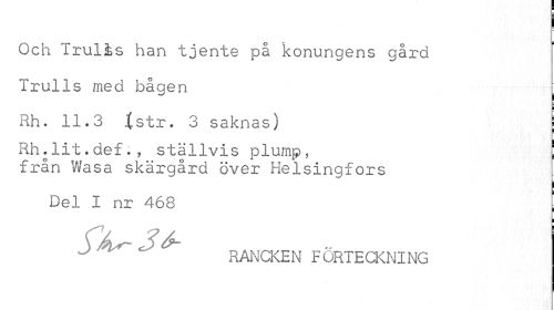 //// Och irulis han tjente på konungens gård //// Trulls med bågen ' //// j //// Rh. 11.3 t str. 3 saknas) \ //// Rh.lit.def., ställvis plump, //// från Wasa skärgård över Helsingfors //// Del I nr 468 ; //// ^ ^ ^ RANCKEN FÖRTECKNING ////