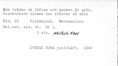 //// » //// Qch träden de löfvas och marken är grön, I //// Hvarendaste blomma hon stånaar så skön //// i //// Sid. 23 Folkmelodi. Westmanland Mel.not. sid. 34. Nr 1. //// 3 str. //// DYBECK RUNA juni-häft. 1844 ////