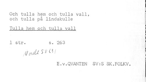 //// Och tulla hem och tulla vall, och tulla på lindakulle //// Tulla hem och tulla vall ! //// 1 str. s. 263 1 //// E. v.QVANTEN SV:S SK.FOLKV. ////