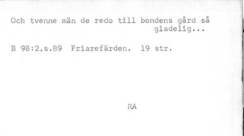 //// Och tvenne män de redo till bondens qård så l //// ¦tlM^ I //// gladelig. . . l //// B 98:2,s.89 Friarefärden. 19 str. //// RA ////