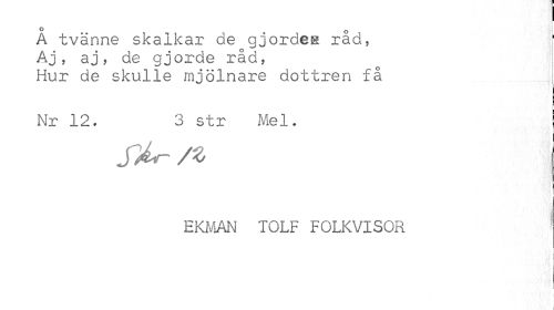 //// ° o //// A tvänne skalkar de gjordes rad, //// Aj , aj, de gjorde råd, //// Hur de skulle mjölnare dottren få //// r //// Nr 12. 3 str Mel. I //// f^n /Z I //// EKMAN TOLF FOLKVISOR ////