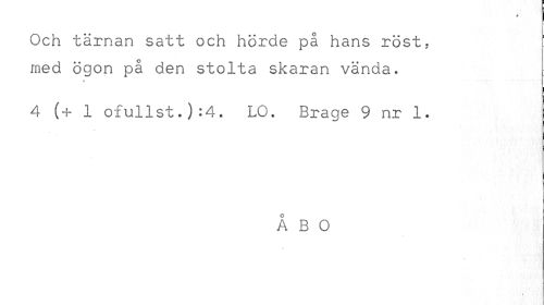 //// * I //// Och tärnan satt och hörde på hans röst, //// med ögon på den stolta skaran vända. //// « //// 4 (+ 1 ofullst.):4. LO. Brage 9 nr 1. //// ÅBO ////