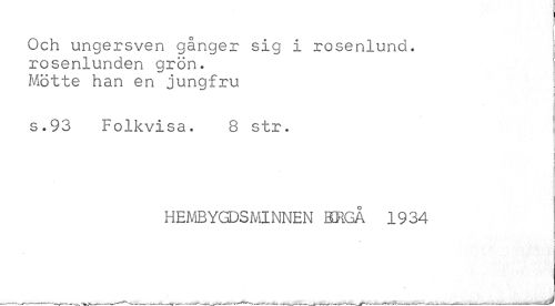 //// I //// Och ungersven gånger sig i rosenlund, rosenlunden grön. Mötte han en jungfru //// s.93 Folkvisa. 8 str. //// HEMBYGDSMINNEN KRGÅ 1934 //// 4 //// ^...^ ^ ^^^^^^ rrttf» m<;u<M\ —tv, - -hk" Wlflf^ ////
