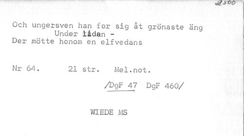 //// Och ungersven han for sig åt grönaste äng //// Under lådan -Der mötte honom en elfvedans //// Nr 64. 21 str. Mel.not. //// /DgF 47 DgF 460/ //// r //// WIEDE MS ////