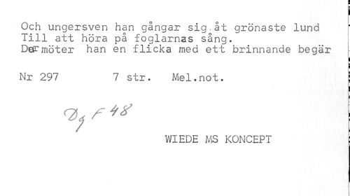 //// Och ungersven han gångar sig.åt grönaste lund //// Till att höra på foglarnas sång. //// Dör möter han en flicka med ett brinnande begär //// Nr 297 7 str. Mel.not. j //// <2* r ** i //// WIEDE MS KONCEPT ! ////