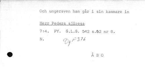 //// . . ... .. ,, .. .. //// Och ungersven han går i sin kammare in //// Herr Peders sjöresa //// 7:4. PY. S.L.S. 542 $.62 nr 8. ////
