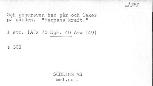 //// otjcr/ //// Och ungersven han går och leker på gården. "Harpans kraft." //// 1 str. (Afz 75 DgF. 40 Afw 149) s 308 //// SODLING MS mel.not. ////