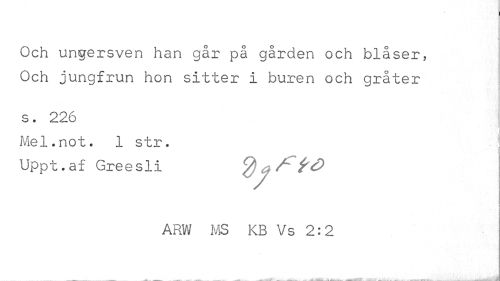 //// Och ungersven han går på gården och blåser, Och jungfrun hon sitter i buren och gråter //// s • 226 //// 1 //// Mel.not. 1 str. Uppt.af Greesli //// ARW MS KB Vs 2:2 //// ; , yÅ ////