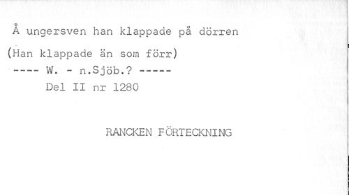 //// o //// A ungersven han klappade på dörren //// (Han klappade än soin förr) //// --- W. - n.Sjöb.? --- //// Del II nr 1280 //// RANCKEN FÖRTECKNING ////