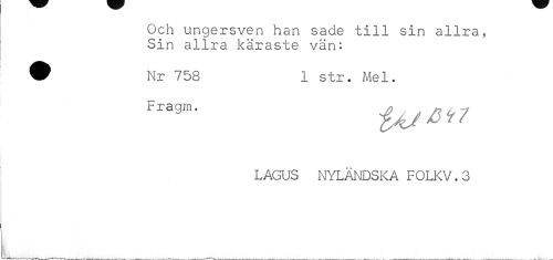 //// Och ungersven han sade till sin allra, Sin allra käraste vän: //// 0 Nr 758 1 str. Mel. //// Fragm. M? //// LAGUS NYLÄNDSKA FOLKV.3 ////