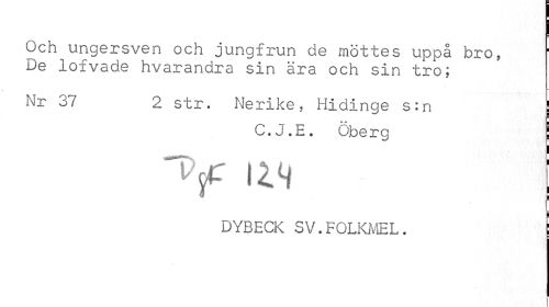 //// Och ungersven och jungfrun de möttes uppå bro, De lofvade hvarandra sin ära och sin tro; //// Nr 37 2 str. Nerike, Hidinge s:n j //// L //// C.J.E. Oberg ! //// DYBECK SV.FOLKMEL. j ////