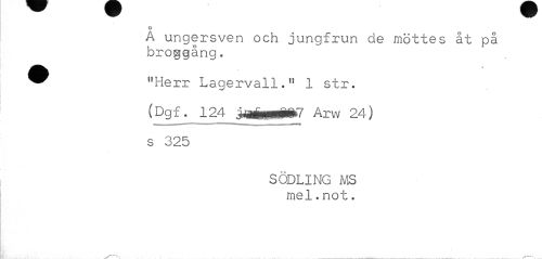 //// o //// A ungersven och jungfrun de möttes åt på broggång. //// • i //// "Herr Lagervall." 1 str. //// s 325 //// SODLING MS mel.not. //// --- —- ////