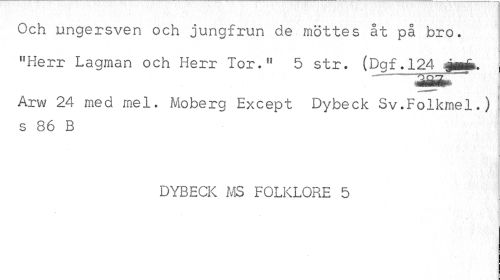 //// Och ungersven och jungfrun de möttes åt på bro. //// "Herr Laaman och Herr Tor." 5 str. (Dgf.124 émå». //// -...-^äiz- //// Arw 24 med mel. Moberg Except Dybeck Sv.Folkmel.) s 86 B //// DYBECK MS FOLKLORE 5 ////