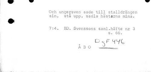 //// Och ungersven sade till stalldrängen sin, stå upp, sadla hästarna mina. //// 7:4. BD. Svenssons saml.häfte nr 3 //// s. 66. //// O^FHVC //// A B 0 ... IttUWJ^ijÉkjg^ ////