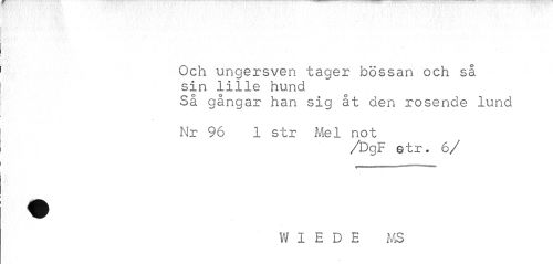 //// Och ungersven tager bössan och så sin lille hund //// Så gångar han sig åt den rosende lund //// Nr 96 1 str Mel not //// /DgF etr. 6/ //// v ..."* //// W I E D E MS ////