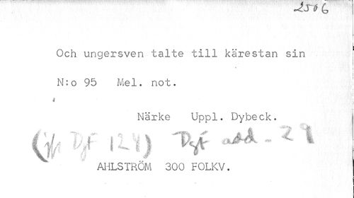 //// t //// Och ungersven talte till kärestan sin ¦ I //// I //// » ! //// t ¦ //// N:o 95 Mel. not. //// t i //// i //// — //// ! //// • [ //// ! //// i //// Närke Uppl. Dybeck. j //// AHLSTROM 300 FOLKV. ////