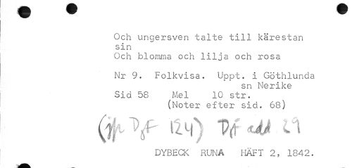//// Och ungersven talte till kärestan sin //// Och blomma och lilja och rosa //// Nr 9. Folkvisa. Uppt. i Göthluncla //// sn Nerike Sid 58 Mel 10 str. //// (Noter efter sid. 68) //// DYBECK RUNA HAFT 2, 1842. ////