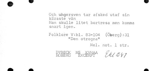//// sv //// Och uhgersven tar afsked utaf sin käraste vän //// Han skulle litet bortresa men komma snart igen. //// Folklore V:bl. 83-104 (Öberg):31 //// "Den otrogna" //// Mel. not. 1 str. //// DYBECK MS KVHAA 0£, »/ -MOBERG EXCERPT Z/U & Yj ////