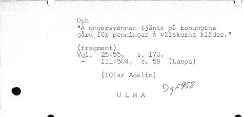 //// Och //// O o //// !IA ungersvennen tjänte pa konungens gård för penningar å välskurna kläder." //// (fragment) //// Vgl. 25:55, s. 173. //// 111:504, s. 58 (Lampa) //// (lölar Adelin) //// m 9 hFW //// ^ U L M A ' ////