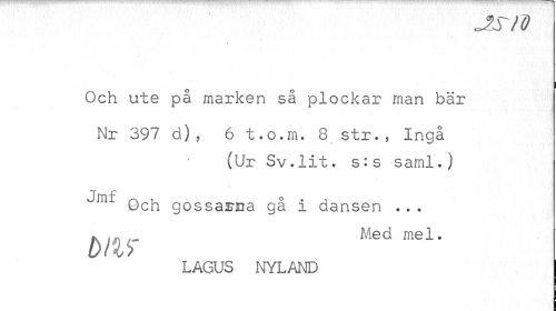 //// Js/d //// j //// Och ute på marken så plockar man bär //// Nr 397 d), 6 t.o.m. 8 str., Ingå //// (Ur Sv.lit. s:s saml.) //// Och gossarma gå i dansen ... f im Med mel. //// bils //// LAGUS NYLAND ////