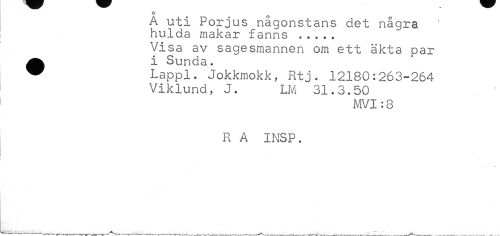 //// o //// A uti Porjus någonstans det några hulda makar fanns ... //// Visa av sagesmannen om ett äkta par //// •i Sunda. //// Lappl. Jokkmokk, Rtj. 12180:263-264 Viklund, J. LM 31.3.50 //// MVI: 8 //// R A INSP. //// % ////