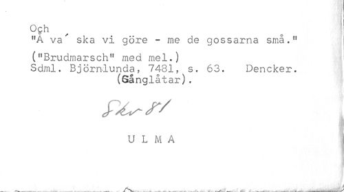 //// Offh , 1 //// f,A va ska vi göre - me de gossarna små." ("Brudmarsch" med mel-) //// Sdml. Björnlunda, 7431, s. 63. Dencker. //// (Gånglåtar). //// P^-r/ //// U L M A : //// ... . /X . . A ////