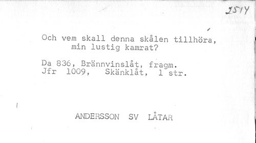 //// jsvy //// ? //// Och vern skall denna skålen tillhöra, //// min lustig kamrat? //// Da 836, Brännvinslåt, fragm. Jfr 1009, Skänklåt, 1 str. //// I //// ANDERSSON SV LÅTAR , //// i ' ' I ////