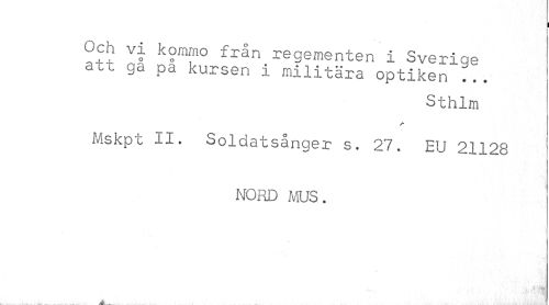 //// I //// Och vi kommo från regementen i Sverioe att ga pa kursen i militära optiken 1. . //// Sthlm //// A //// Mskpt II. Soldatsånger s. 27. EU 21128 //// NORD MUS. //// 1 //// ___ ////
