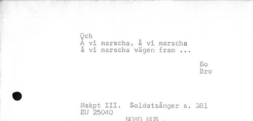 //// Och //// o //// A vi marscha, å vi marscha å vi marscha vägen fram ... //// Bo Bro //// Mskpt III. Soldatsånger s. 381 EU 25040 //// KTOPn Ml TQ ////