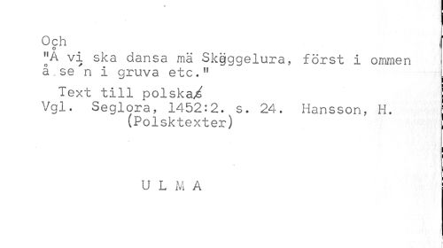 //// Och I //// O //// 'JA vi ska dansa mä Skgggelura, först i ommen å. se'n i gruva etc.M i //// Text till polska^ Vgl. Seglora, 1452:2. s. 24. Hansson, H. //// (Polsktexter) //// i //// i //// U L M A //// J i ////