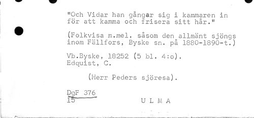 //// "Och Vidar han gångar sig i kammaren in för att kamma och frisera sitt hår." //// ^ (Folkvisa m.mel. såsom den allmänt sjöngs //// inom Fällfors, Byske sn. på 1880-1890-t.) //// Vb.Byske, 18252 (5 bl. 4:o). Edquist? C. //// (Herr Peders sjöresa). DgF 376 //// L5 U L M A //// » t ¦•¦ . ////