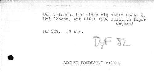 //// • • //// y; T -' —7 ^ ¦ ft * T '?frs .¦—« f ¦ * * - ? ' t. //// Och Vildemo, han rider sig söder under ö, Uti löndom, att fäste Tide lilla,en fager //// unge.rrnö //// Nr 329, 12 str. //// AUGUST BONDESONS VISBOK ////