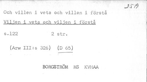 //// jr/f //// Och villen i veta och villen i förstå Vil.ien i veta och vil.ien i förstå //// s.122 2 str. //// (Arw III:s 326) (D 65) //// r //// BORGSTRÖM MS KVHAA ////