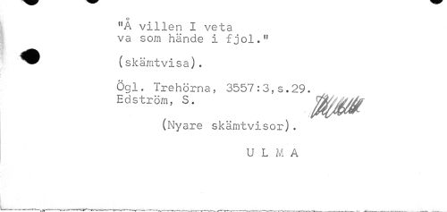 //// o //// UA villen I veta va som hände i fjol." //// K; //// ^^ (skämtvisa), //// Ögl. Trehörna, 3557:3,s.29. Edström, S. Jj^ //// (Ny are skämtvisor). //// U L M A //// • i.'. — ___ —-_ .. —- _ ___ . ___- . . v >.4__ '>._ __- . M ___... . r. "w ¦ ** ////