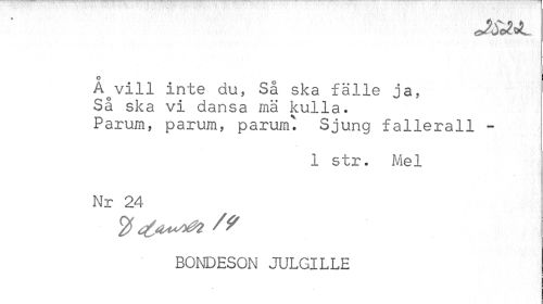 //// o 0 //// A vill inte du, Sa ska fälle ja, //// Så ska vi dansa mä kulla. //// Parum, parum, parum*. Sjung fallerall - //// 1 str. Mel //// Nr 24 //// BONDESON JULGILLE //// 2 ////