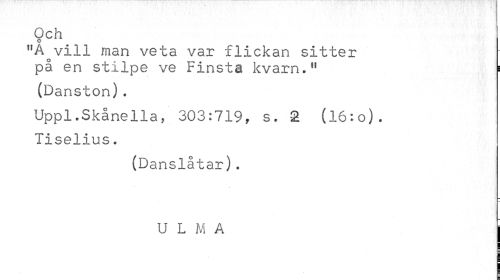 //// Och //// O //// "A vill man veta var flickan sitter på en stilpe ve Finsta kvarn.11 s //// (Danston). //// Uppl.Skånella, 303:719, s. 2 (l6:o). //// Tiselius. //// (Danslåtar). //// U L M A | ////