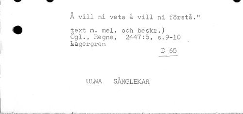 //// o //// A vill ni veta a vill ni förstå." //// ^^ text m. mel. och be skr.) //// ögl., Regne, 2447:5, s.9-10 Lagergren //// D 65 //// ULMA SÅNGLEKAR //// —___^^S^n.__.„___—. J-v___---r-<---^ ////