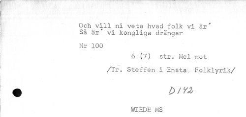 //// Och vill ni veta hvad folk vi är' Så är' vi kongliga drängar //// Nr 100 //// 6 (7) str. Mel not //// /Tr. Steffen i Ensta-v Folklyrik/ //// % D/n //// WIEDE MS ////
