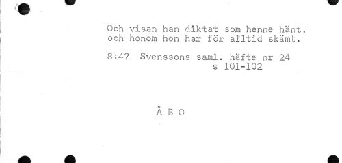 //// t. fl i I //// Och visan han diktat som henne hänt, och honom hon har för alltid skämt. //// 8:4? Svenssons saml. häfte nr 24 //// s 101-102 //// ÅBO ////