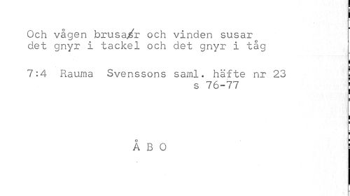 //// Och vågen brusa/r och vinden susar det gnyr i tackel och det gnyr i tåg //// i //// 7:4 Rauma Svenssons saml. häfte nr 23 ! //// s 76-77 j //// i //// i //// i //// i //// ÅBO ////