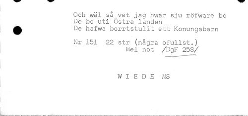 //// Och wäl så„vet jag hwar sju röfware bo De bo uti Östra landen ^ De hafwa borrtstulit ett Konungabarn //// Nr 151 22 str (några ofullst.) //// Mel not /DgF 258/ //// W I E D E MS ////