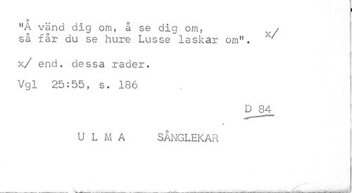 //// O //// 11A vänd dig om, å se dig om, / //// så får du se hure Lusse laskar om11. //// x/ end. dessa rader. Vgl 25:55, s. 186 //// U L M A SÅNGLEKAR //// _x. ...¦ ////