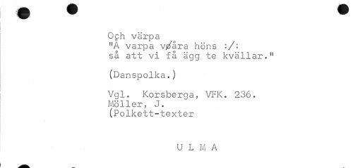//// Och värpa //// flA varpa v/åra höns :/: så att vi få ägg te. kvällar." //// {Danspolka.) //// Vgl. Korsberga, VFK. 236. Möller, J. (Polkett-texter //// U L M A //// i ^^^ ////