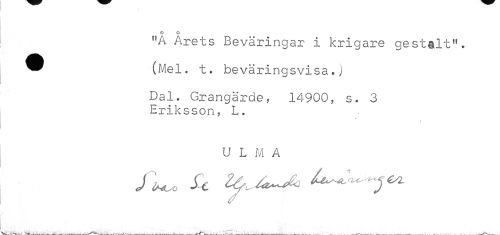 //// o o //// "A Arets Beväringar i krigare gestalt". //// w (Mel. t. beväringsvisa «j //// Dal. Grangärde, 14900, s. 3 Eriksson, L. //// U L M A ////
